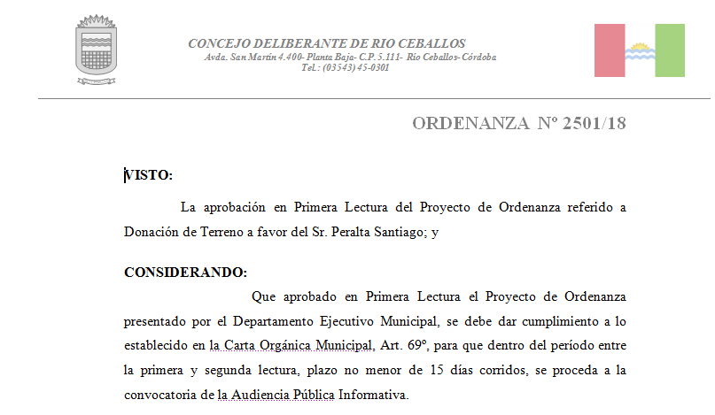 El Concejo Deliberante convoca Audiencia Pública para informar sobre el Proyecto de Ordenanza referido a “Donación de Terreno a favor del Sr. Santiago Peralta”.-