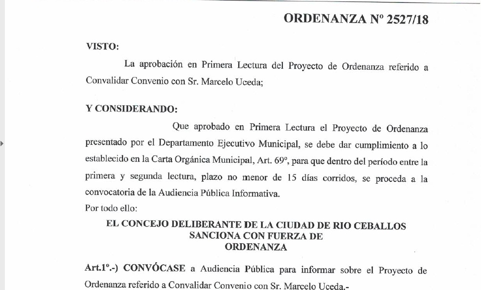 El Concejo Deliberante convoca Audiencia Pública para informar sobre el Proyecto de Ordenanza referido a “Convalidación de Convenio con Sr. Marcelo Uceda”