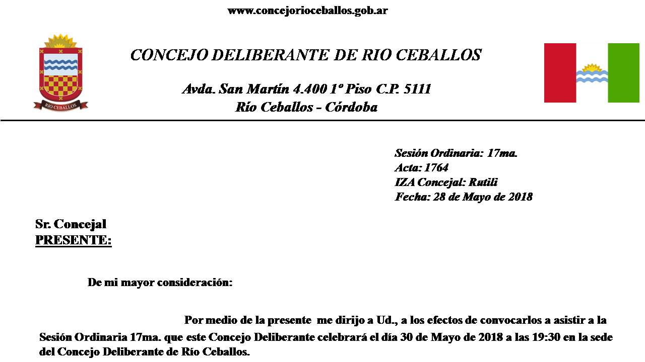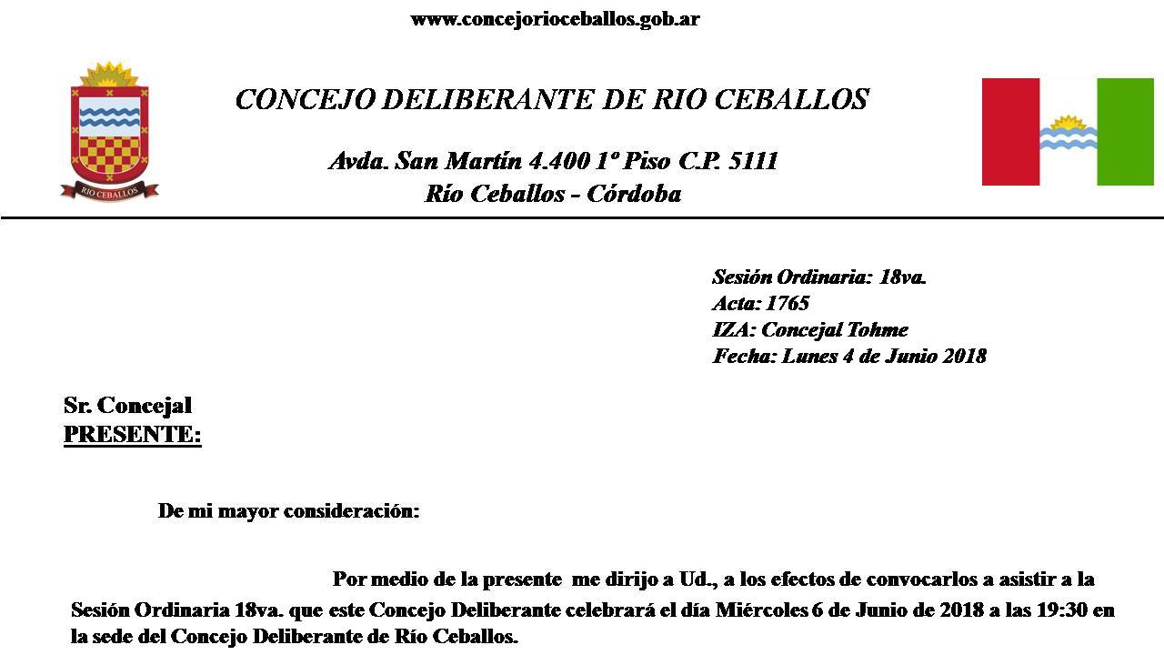24 de Septiembre de 2018: Orden del día 34ta. de fecha 26 de Septiembre de 2018 ORDEN DEL DIA Lectura del Acta anterior.- Lectura de Notas.- Proyecto de Ordenanza referido a “Convalidación de Convenio celebrado entre la Municipalidad de Río Ceballos y Sra. Magallanes”.- Informes de Comisión.- DESCARGAR ORDEN DEL DIA ORDINARIA 34°