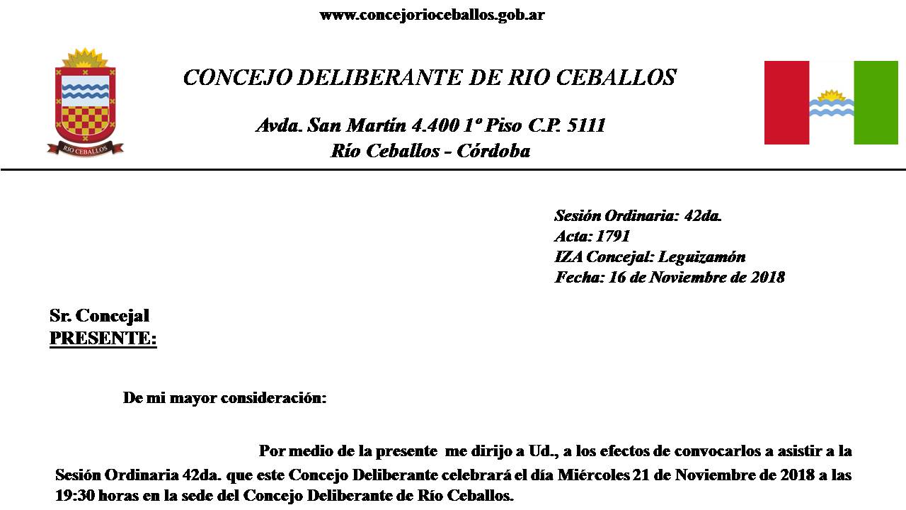 16 de Noviembre de 2018: Orden del día 42da. de fecha 21 de Noviembre de 2018 ORDEN DEL DIA 1.- Lectura del Acta anterior.- 2.- Lectura de Notas.- 3.- Proyecto de Resolución referido a “Pedido de Informe sobre Obra de Red de Gas Natural- Presentado por Concejal Leguizamón”.- 4.- Informes de Comisión.- Descargar Orden del Día orden del dia 42da