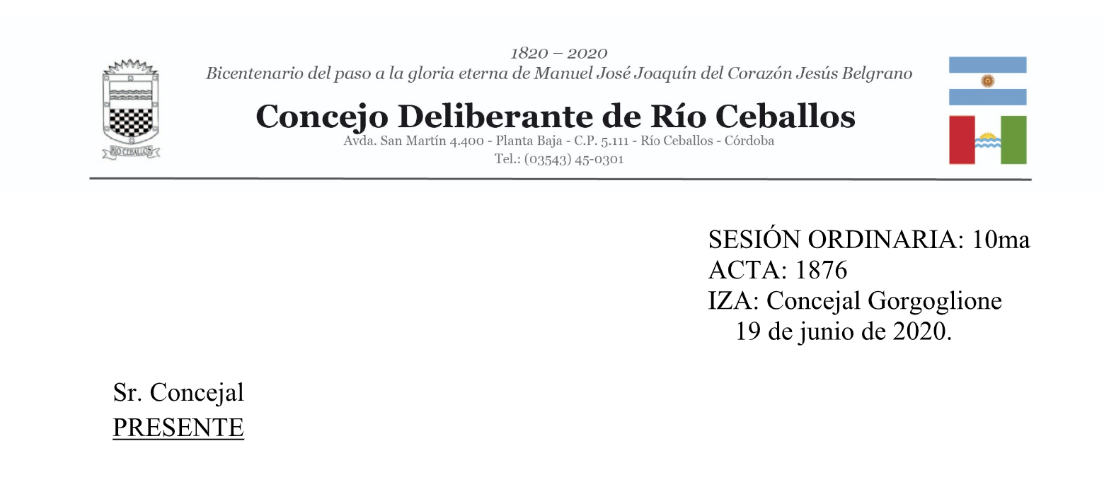 Por medio de la presente me dirijo a Ud. a los efectos de convocarlo a asistir a la Sesión Ordinaria 31ra que este Cuerpo Deliberativo celebrará el día Martes 24 de Noviembre de 2020, a la hora 9:00, en la sede del Concejo Deliberante de Río Ceballos.